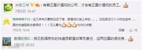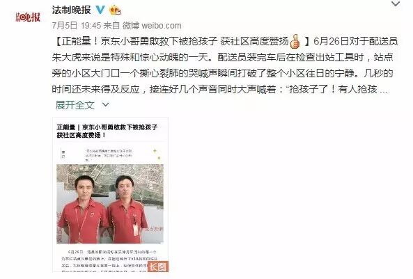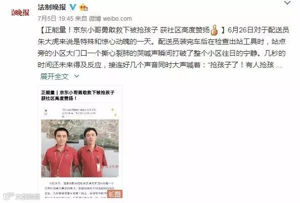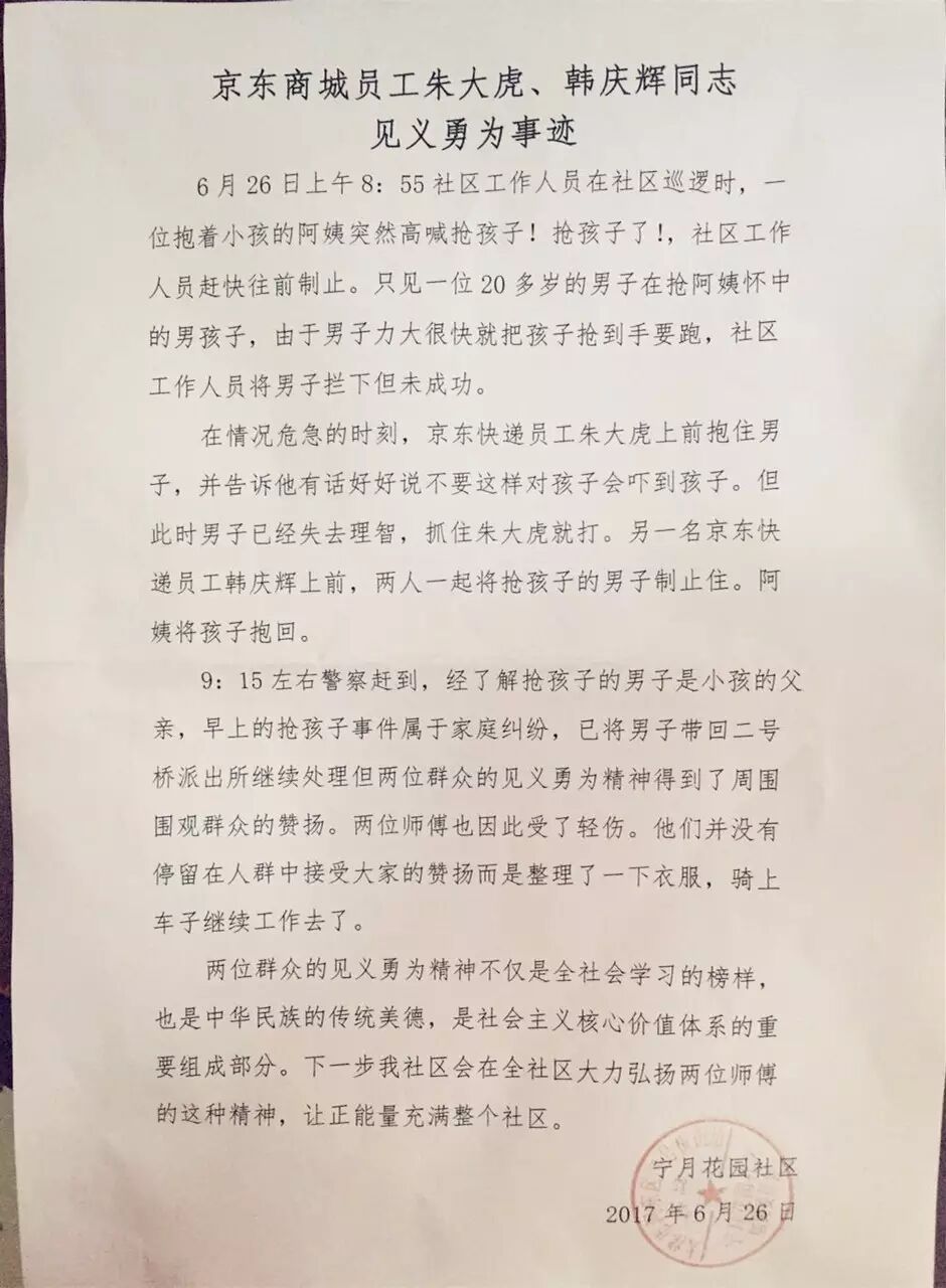因与抢孩子的男子发生摩擦,勇敢上前的配送员朱大虎眼部、手部、腿部多处受伤,居委会同志劝朱大虎去医院检查一下,朱大虎却乐着说“没事,不用了,我们还得送货去,不能耽误客户的时间。”围观的群众这时都为两名配送员的见义勇为竖起了大拇指。居委会也给予了高度评价,两名配送师傅并没有因为表扬而沉浸在此中,而是整理完衣服,骑着三轮开始自己的配送工作。下午三点左右,居委会送来了表扬信,感谢两位配送员对小区的治安维护。紧接着被抢孩子的外祖父母也来到站点,感谢对外孙的救命之恩,阿姨从兜里掏出了两个红包,说是对两位师傅感谢和奖励。两位师傅坚决不收,说这是我们应该做的。阿姨说:“有你们这样的年轻人在我们身边,太好了。你们的精神风貌应该被肯定,社会需要你们这样的正能量啊!感谢京东培养出这么优秀的员工。”