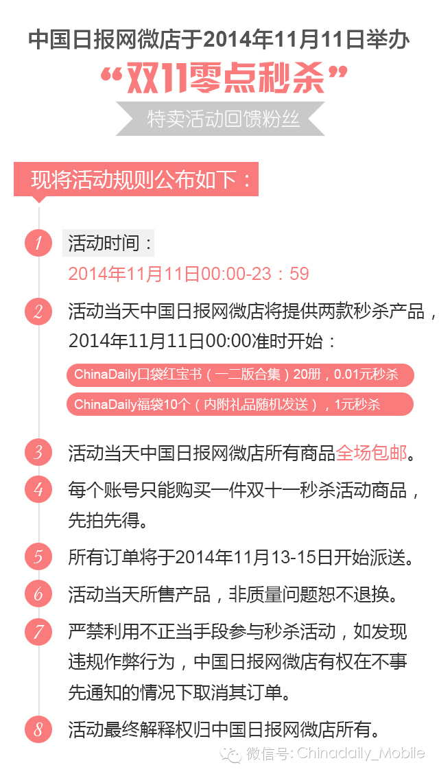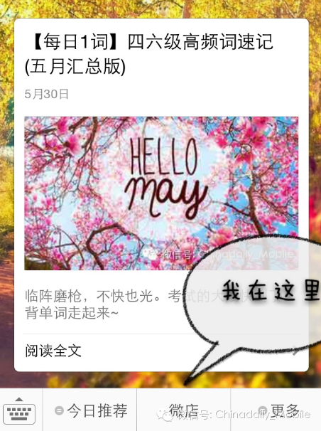 找到中国日报网微店的方法:关注中国日报网双语新闻微信号(Chinadaily_Mobile),在主页最下方点击"微店"进入。