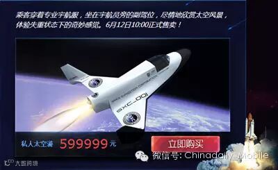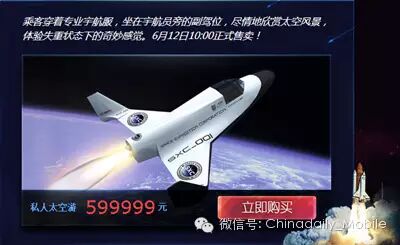 Taobao announced it will work with the Space Expedition Corp (SXC) to introduce private space tourism to China, Qianjiang Evening News reported. The entire space flight will last for about an hour, with 5-6 minutes in outer space at more than 100km high. Tourists have to conduct stimulated flight and zero gravity training at a training base in the US or Russia before their departure, which is expected in 2015. The space tour packages will be launched on Taobao's travel channel Thursday. There are 3 packages in all, with the cheapest one priced at about RMB600,000.