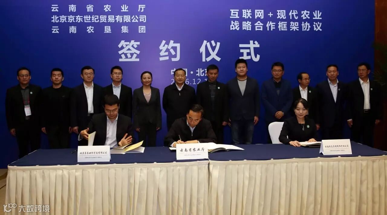 12月15日,京东集团与云南省农业厅、云南农垦集团在京共同签署了“互联网+现代农业”战略合作框架协议,协议三方将发挥各自优势,探索“互联网+”现代农业领域合作机会,促进云南省农业和农村电子商务发展,助推云南高原特色现代农业的发展。云南省副省长张祖林,云南省农业厅厅长王敏正,云南农垦集团董事长陈祖军,京东集团高级副总裁熊青云等出席签约仪式。