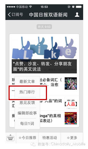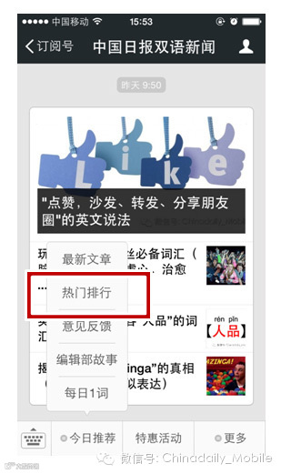 点击导航条上的“热门排行”,可以看到近期最受欢迎的5篇文章。该排行半个月更新一次,如果希望看到以往的热门稿件,还可通过在微信分别回复排行榜1、排行榜2、排行榜3、排行榜4、排行榜5、排行榜6、排行榜7,进行查看。