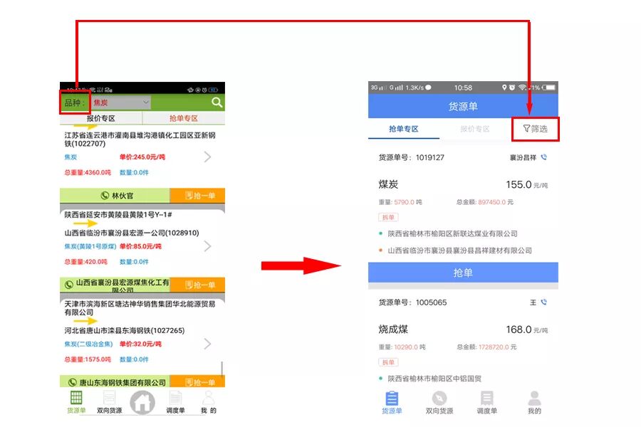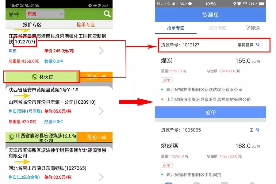 每条货源都为一个板块,分别包括:货源单号、取单地、目的地、品种、单价、重量、联系人,在旧版系统中,货源单号位于每单地址后、联系人位于每单下方左侧,系统优化升级后,联系人与货源单并列。