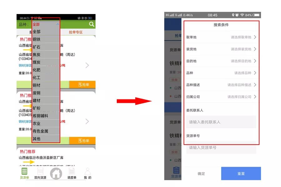 在旧版系统中,只有可以筛选品种的功能,在新版系统中,不仅保留了原有的品种功能,还增加了更多的功能,包括取单地、装货地、目的地、归属公司、委托联系人、货源单号等搜索条件。