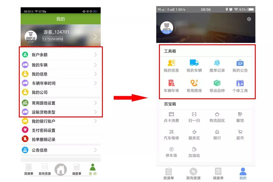 在旧版系统上,每个功能仅有文字描述,所有的文字放在一起难免会有杂乱感,在经过系统升级后,与司机有关的所有功能汇合在一起统称为“工具箱”且每个功能都有一个自己独立的小图标,司机在选择时有图标的展示更直观得体。