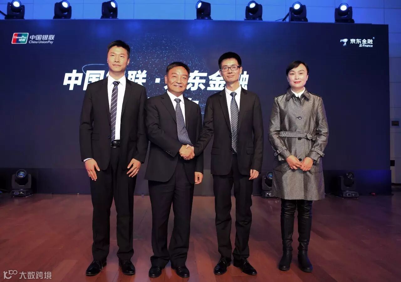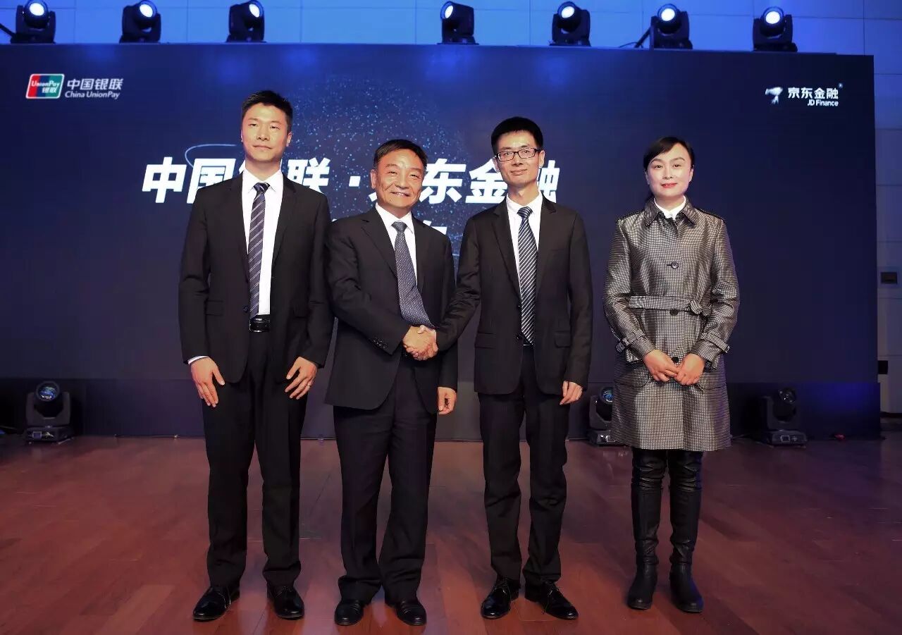 (左起:京东金融副总裁许凌、中国银联总裁时文朝、京东金融首席执行官陈生强、中国银联助理总裁胡莹)