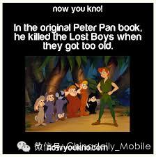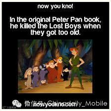 In the original Peter Pan book, he killed the Lost Boys when they got too old...图上这句话简直太毁童年了...