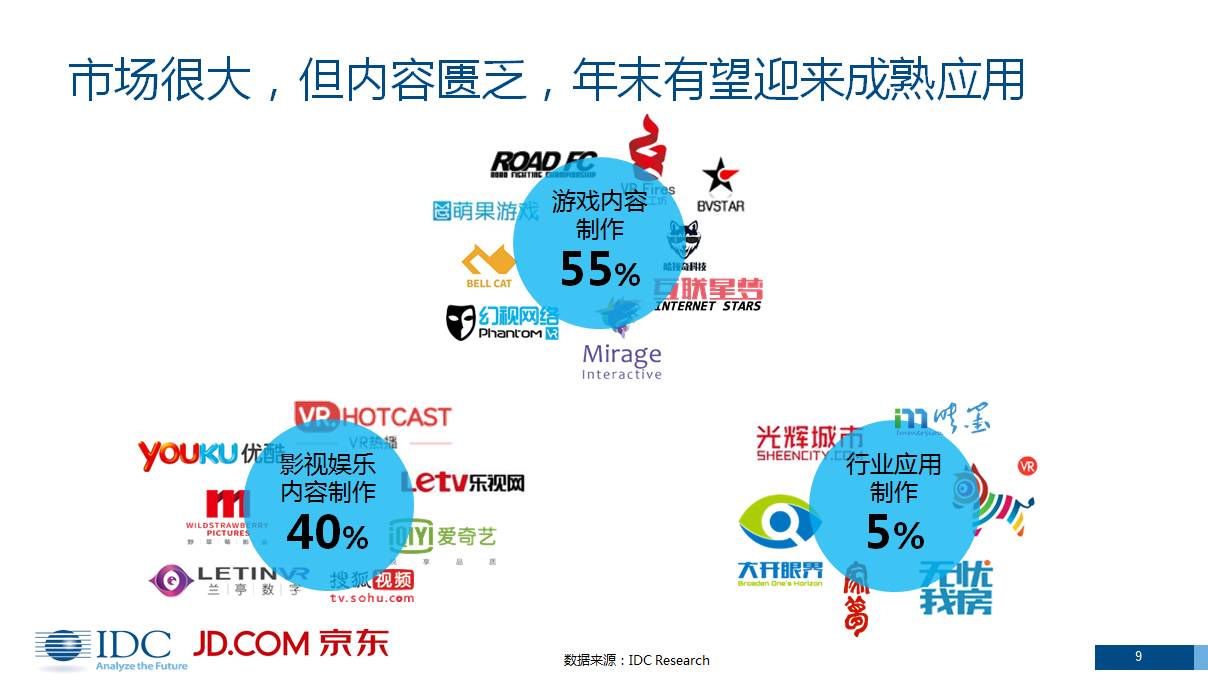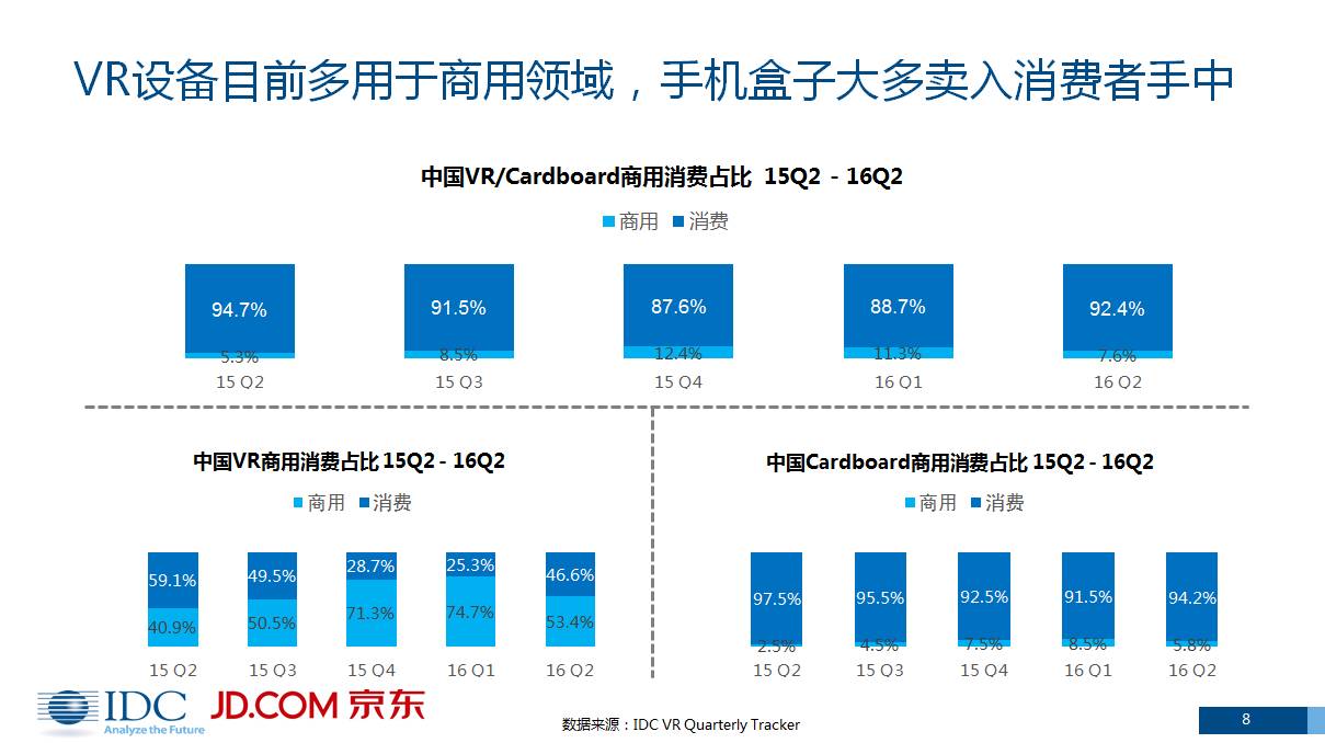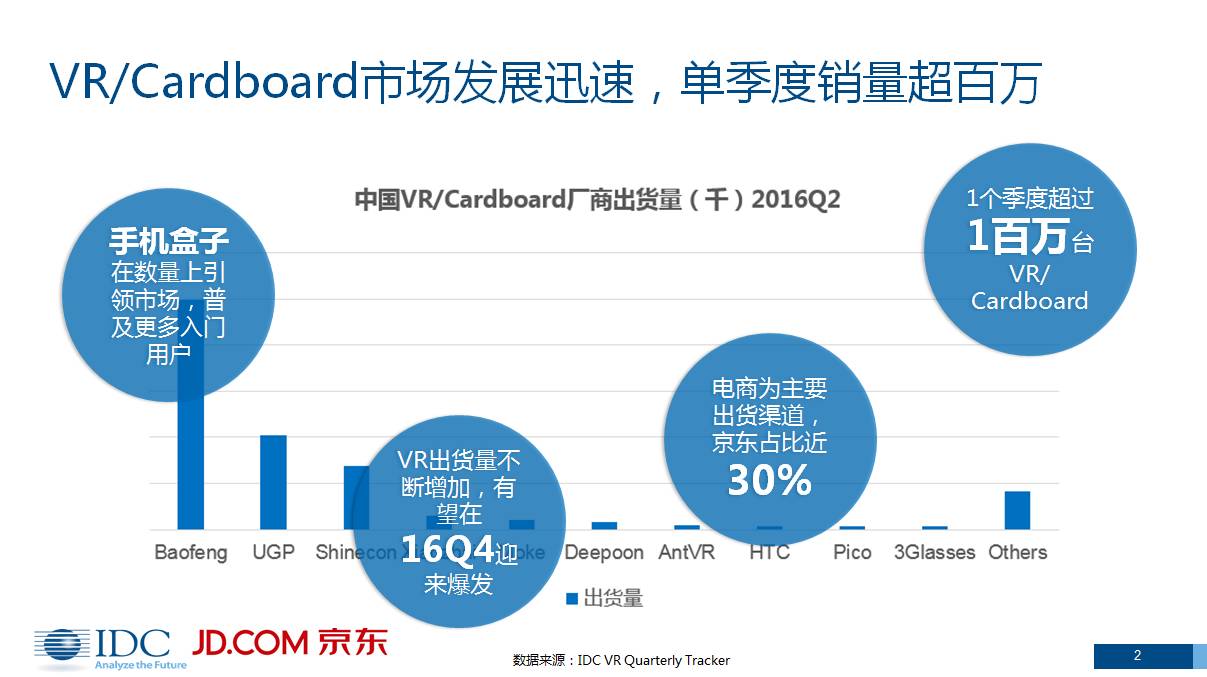 IDC认为,VR产品有望在2016年Q4迎来爆发。同时电商已经成为VR产品的主要销售渠道,京东占市场整体销量的近30%。