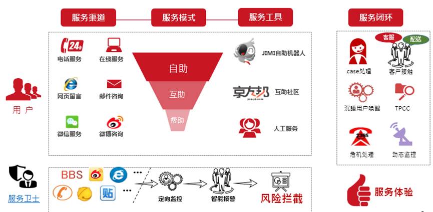 基于用户需求及大数据的应用,京东全国客服中心建设多元服务渠道作为咨询载体,以自助、互助、帮助为一体的三助服务模式为基准,借助JIMI智能机器人、京友邦等工具,通过服务卫士的全方面监控管理及联动各前后端部门对客户诉求进行闭环管理,不断促进客户服务体验的提升。