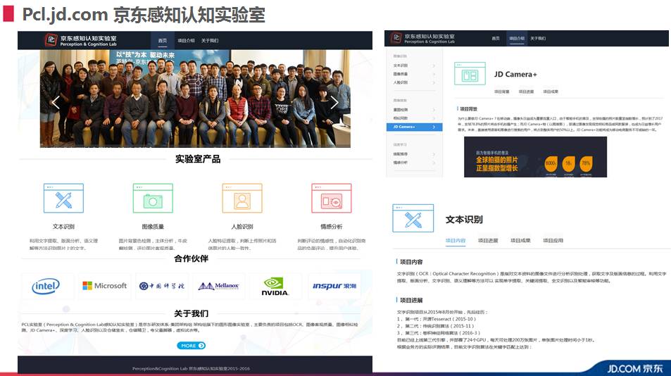 目前,包括京东商城的推荐、搜索、图片识别、人脸识别、服装搭配,以及京东金融的人脸识别、身份证识别、银行卡识别,都采用了PCL实验室的技术成果,同时,这些技术也深入到如语音识别、智能冰箱、无人仓视觉识别、无人机障碍识别、无人车感知等众多的业务场景中,为京东提升效率、节约成本做出了贡献。