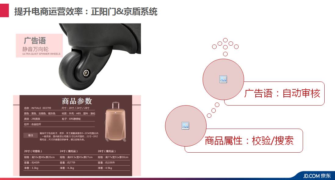PCL实验室研发经理王永亮则提到了OCR和语义分析,即通过文本识别,对商品图片中的信息进一步提取和利用,可以提取广告语帮助后端进行广告语审核。该功能也已在京东正阳门系统进行应用,同时也可以抽取商品属性信息,用于商品主页展示、搜索、客服机器人理解力提升。此外,PCL实验室还开发有银行卡和身份证识别系统,让以前人工的、耗时费力的身份证校验,变成自动化。
