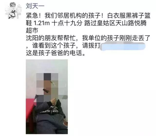 当时情况十万火急,我们发现孩子不见的时候马上去了他们家楼下超市调监控,发现孩子已经出门一个多小时了。” 沈阳小海龟自闭症训练中心主任孙丽娜说得知消息后十分焦急并第一个发出了朋友圈,“我当时特别着急,发动全院员工一起出去找,我朋友圈也有两千多人,大家都在帮我转发。”