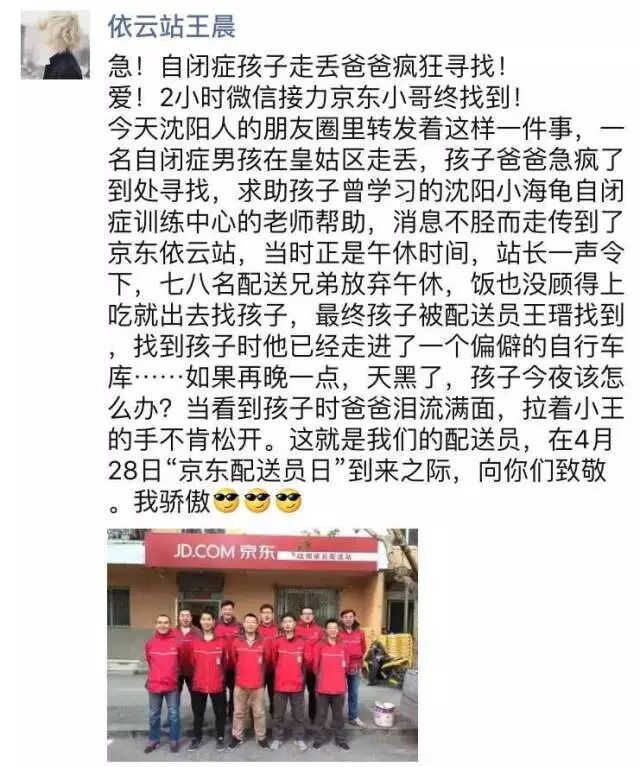 训练中心对面,有我们的京东配送站-沈阳依云站,因为平时也经常去配送,所以大家都比较熟悉,而此时,我们的站长刘天一也通过孙院长的朋友圈得知这个消息,站长马上把信息发到了站点的微信群,此时正值午休时间,全站的配送员在收到消息的第一时间全部终止了午间休息,自发的来到街上帮着寻找孩子。此时,刚刚吃完午饭的京东配送员王瑨看到了这条信息。也加入了寻找孩子的队伍。
