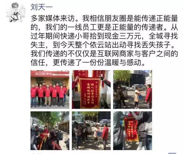 配送部对依云站全体员工、站长刘天一、配送员王瑨,进行了全区域的表彰鼓励。我们的一线员工是正能量的传递者。从过年期间快递小哥拾到现金三万元,全城寻找失主,到今天整个依云站出动寻找丢失孩子。