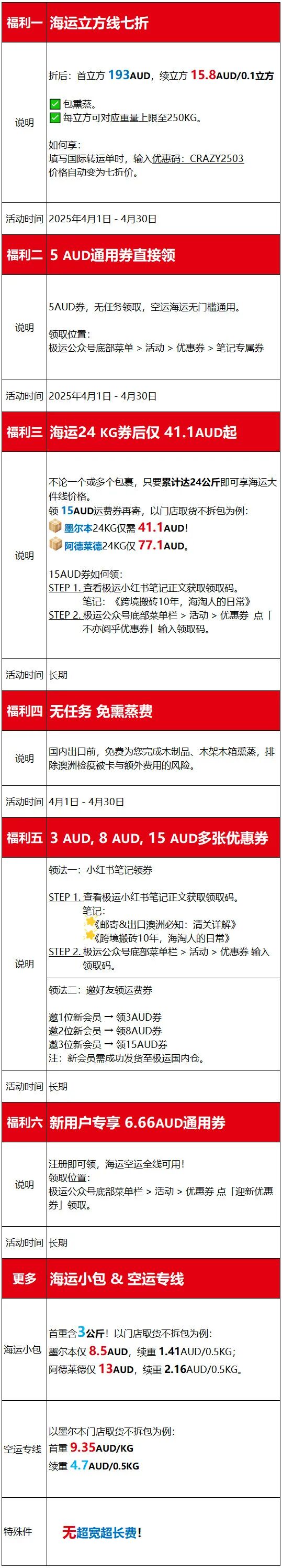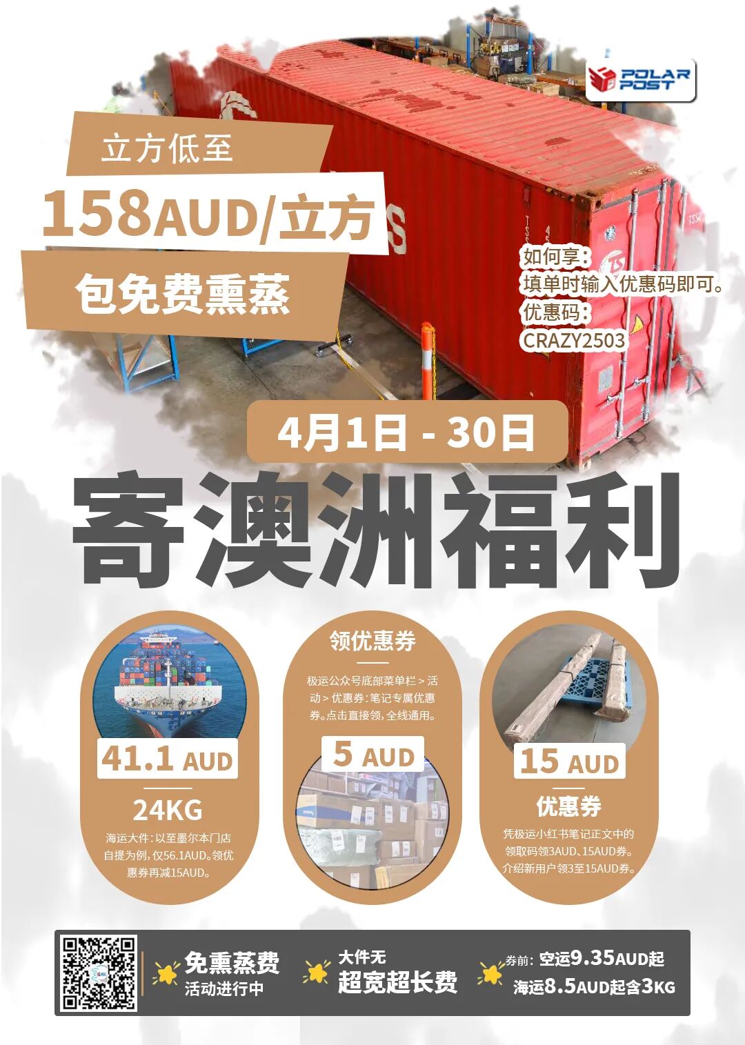 这个四月,🌟大件、🌙超大件、💫超宽超长件、✨小包裹寄澳洲,双清+包熏蒸、运费优惠码、通用优惠券,各项福利继续在线,为您省心+省薪~