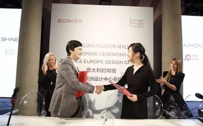 第一届IMT成员京东商城服饰家居事业部海外业务部总经理陈婉(右)代表京东与欧洲设计中心签署合作协议