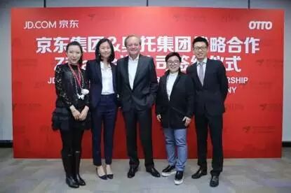 第一届IMT成员京东全球购总经理邱煌(右一)和第一届IMT成员京东全球购业务总监许庆飞(左一)代表京东与德国奥托集团签约