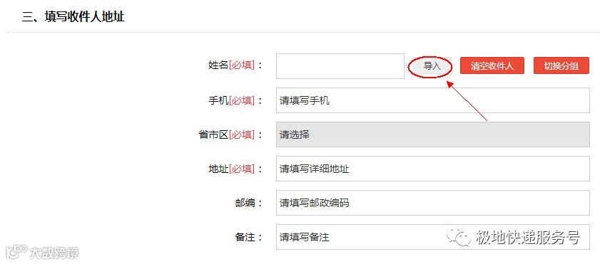 5、填写收件人地址,或者点击“导入”,选择列表中已有的收件人信息;