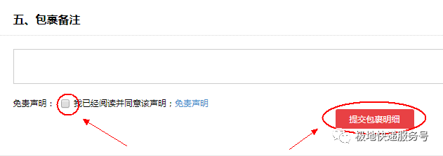 7、阅读“免责声明”并勾选方框,然后点击“提交包裹明细”即可;