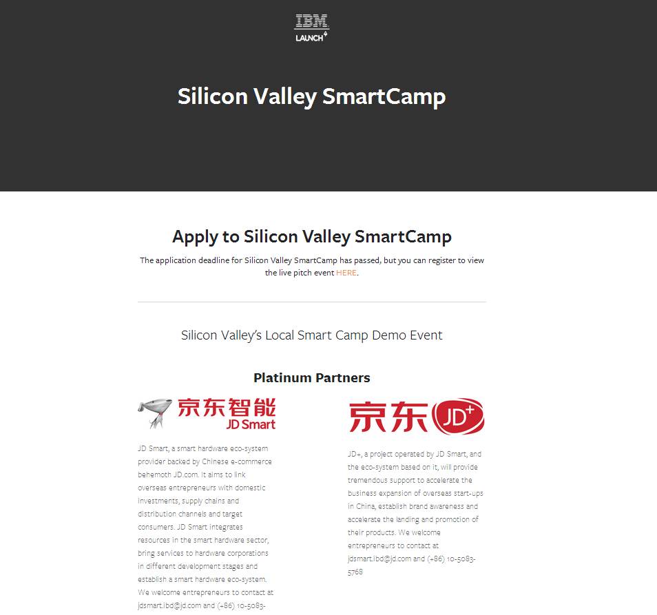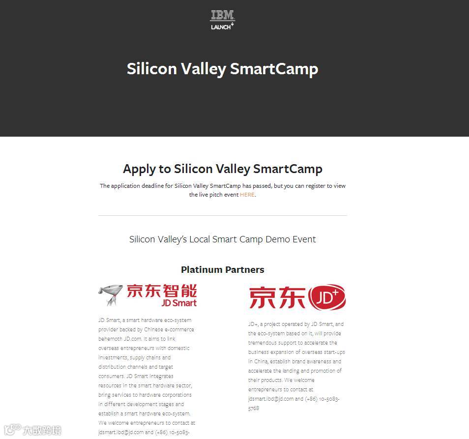 IBM SmartCamp全球创业大赛,是由IBM发起的全球范围的创业扶持项目,每年的参赛团队覆盖30余个国家。今年,京东智能携京东JD+生态,一举成为大赛,2015年度美国西赛区(硅谷、旧金山)的官方合作伙伴。借由此次合作,京东智能开始进入美国硅谷,在海外创投圈树立自身的地位,京东JD+生态也成为连接国内外智能行业资源的重要桥梁。