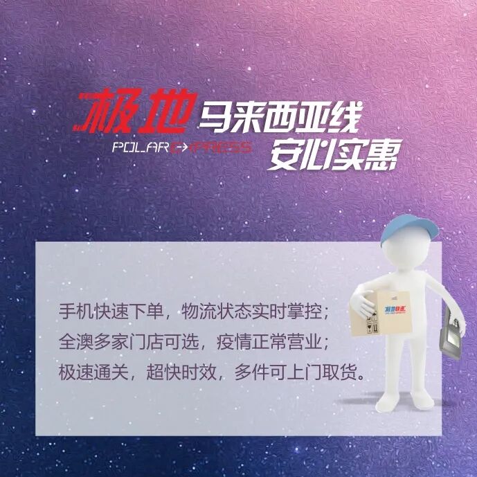 全新开通的极地马来西亚线,为疫情期间身处澳洲的小伙伴们带来极大便利。全澳门店正常营业,维州的小伙伴,如果单次有大量包裹邮寄,还可以预约上门取货服务!