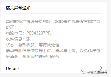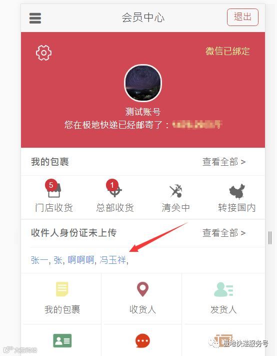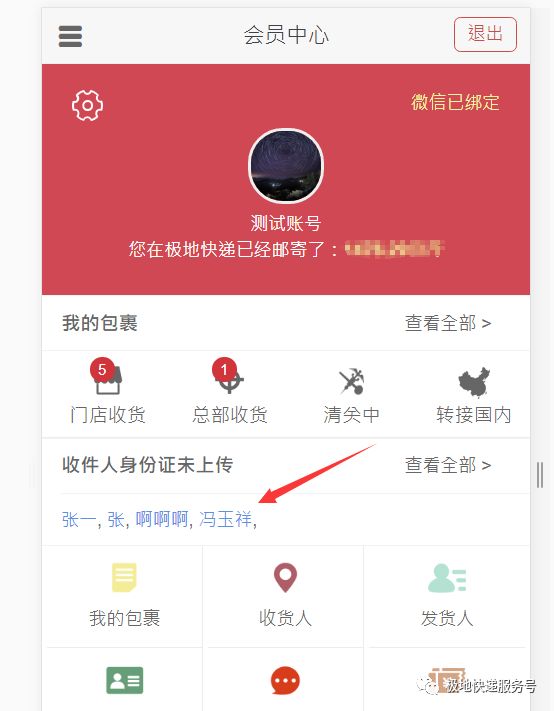 1、如果收件人的身份证还未上传,系统会自动发送微信推送到会员的极地服务号,提醒XXX的身份证需要上传;