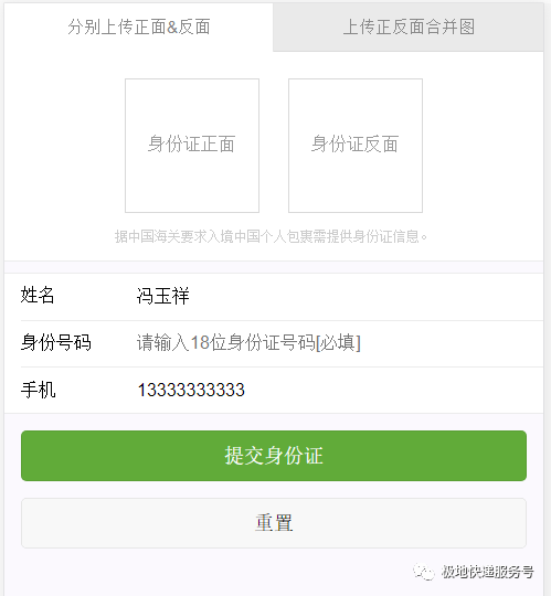 3、收件人点击改连接以后,直接跳转到身份证上传页面,同时收件人姓名和电话也会显示在上传页面相应的位置,收件人自行上传正反面,系统自动识别身份证姓名和身份证号码并填入到相应的输入框,点击提交,身份证上传完成。