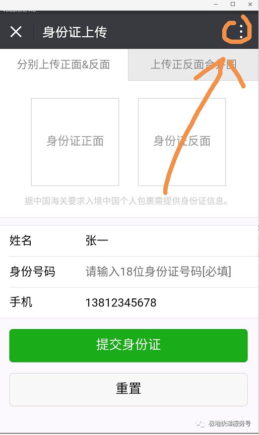 3、直接跳转到身份证上传页面,点击上传页面右上角的三个点;
