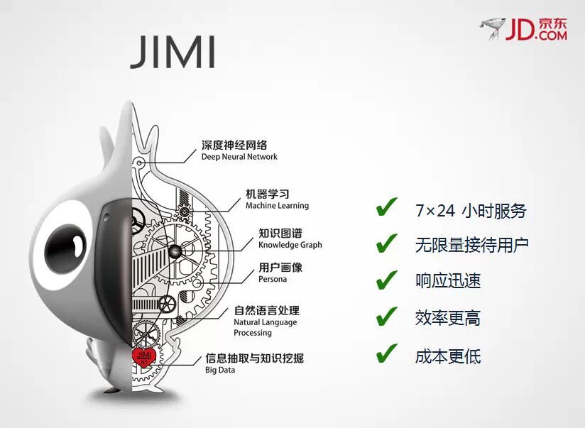 JIMI机器人是京东自主研发的人工智能系统,使用自然语言处理、深度神经网络、机器学习、用户画像等技术,为用户提供全天候、无限量的咨询服务。