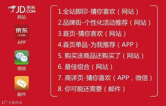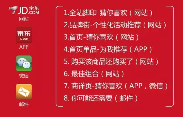 京东的大数据已经全面用于京东的运营当中,它所带来的是最佳的用户体验和运营效率的提升。包括用户消费行为的深度挖掘、EDM精准营销策略实施、销量预测与库房自动补货、搜索推荐系统的持续优化、物流配送、广告精准投放等。
