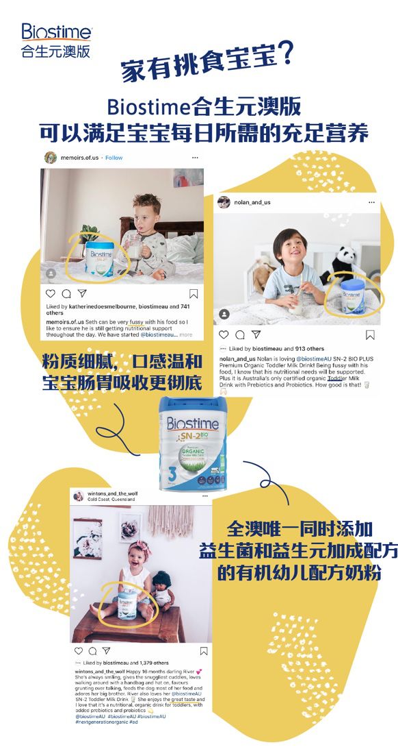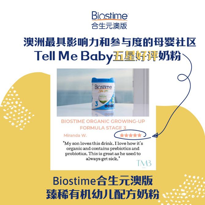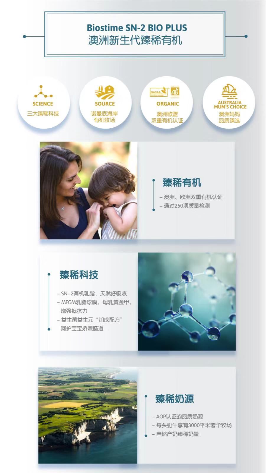 Biostime SN-2 BIO PLUS™合生元澳版臻稀有机幼儿配方奶粉 THE POWER OF SOURCE 天然的力量 甄选法国诺曼底AOP奶源保护区纯净有机牧场的臻稀奶源。北纬49度“黄金奶源带”的海岸牧场,距离海岸线仅1公里,一年200多天的雨水滋养,使这里土壤肥沃、牧草丰美,天然含有丰富的矿物质等营养元素。 THE POWER OF ORGANIC 有机的力量 “金字塔尖”的有机保障,每头诺曼底奶牛私享3000平米有机牧场,自然散养,自然产奶。没有激素催乳,一切都遵循自然法则。每头诺曼底奶牛的产量仅为普通奶牛的二分之一,臻稀奶源,臻稀奶量。 THE POWER OF SCIENCE 科学的力量 受母乳黄金标准所启发由拥有二十余年经验的儿童营养学专家结合科学与自然的力量 · 天然含有SN-2有机乳脂——与母乳相似的脂肪结构,营养好吸收· MFGM乳脂球膜——如同母乳中珍贵的“黄金盔甲”,增强抵抗力和脑部发育· 添加益生菌&益生元“加成配方——呵护宝宝娇嫩肠胃THE BIGGEST LAUNCH IN THE CATEGORY 澳洲奶粉行业规模最大的产品发布会Biostime在悉尼The Edge正式登陆澳洲和万千澳洲妈妈一起,开启新生代育儿旅程Biostime空降悉尼歌剧院中澳明星新生代妈妈齐聚一堂,交流育儿心得 Biostime独家携手墨尔本博物馆共同探索宝宝奇妙世界 AUSTRALIA MOM’S CHOICE澳洲国民女神米兰达·可儿信赖的奶粉品牌 澳洲最大母婴社区Tell Me Baby五星推荐 澳洲妈妈的品质甄选让妈妈放心的宝宝“臻稀口粮” 臻稀营养成分澳大利亚和欧盟双重有机认证结合科学与自然的力量MORE THAN ORGANICGIVE THE NEXT GENERATION THE GREAT START TODAY FOR TOMORROW(文章内容由Biostime品牌方提供)