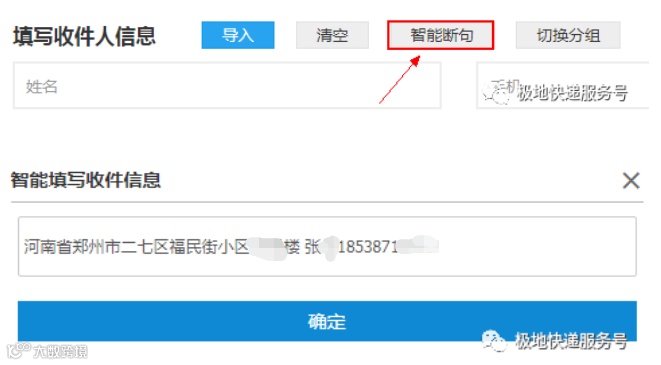 关闭窗口,点击填写收件人信息区域的“智能断句”图标,然后将信息粘贴到空格中,点击确认;