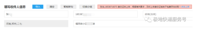 如果收件人身份证照片还未上传,系统会跳出红框提示。可以选择框内的“点击上传”,手机微信端即可收到自动上传链接推送;也可以忽略提示,之后上传,继续填单。