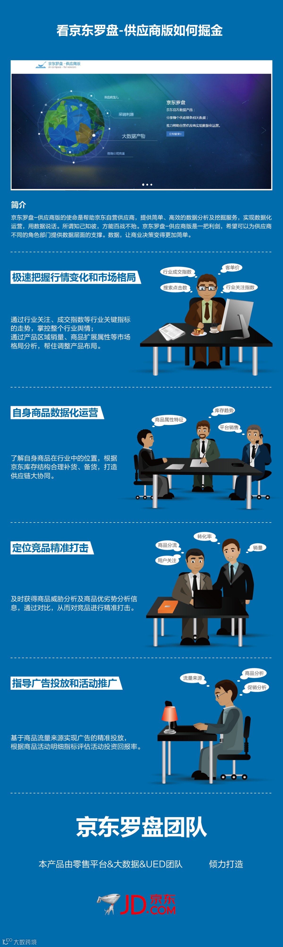 据了解,“京东罗盘-供应商版”融合了京东云计算技术,跨越了业界大数据、高并发、实时展示的三大门槛,可以为自营供应商提供基于京东整个销售大盘细分类目的数据分析,是辅助自营供应商“精准营销、数据掘金”的强大工具。服务内容包括: