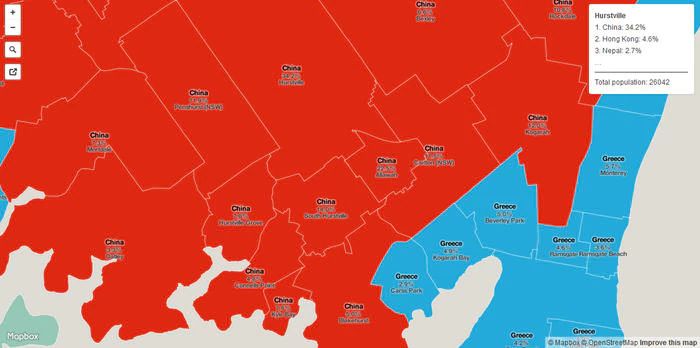 悉尼南区Hurstville 有34.2%的人口出生于中国大陆,是悉尼最大密度的华人区。出生自香港的人口有4.6%。