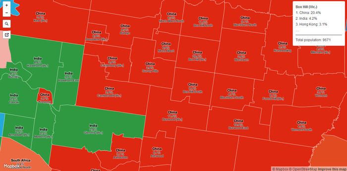 在墨尔本Box Hill是最大的华人社区,出生自中国大陆的人口高达20.4%,3.1%的人口出生自香港。
