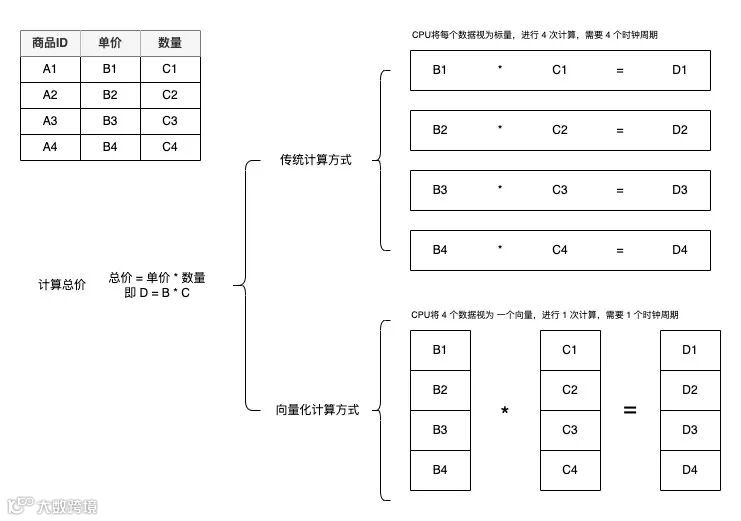 向量化执行不是一次处理一条数据,而是将数据分成批量(通常是固定大小的数据块),然后一次性处理整个批次的数据。例如,一次处理1024个数据元素。