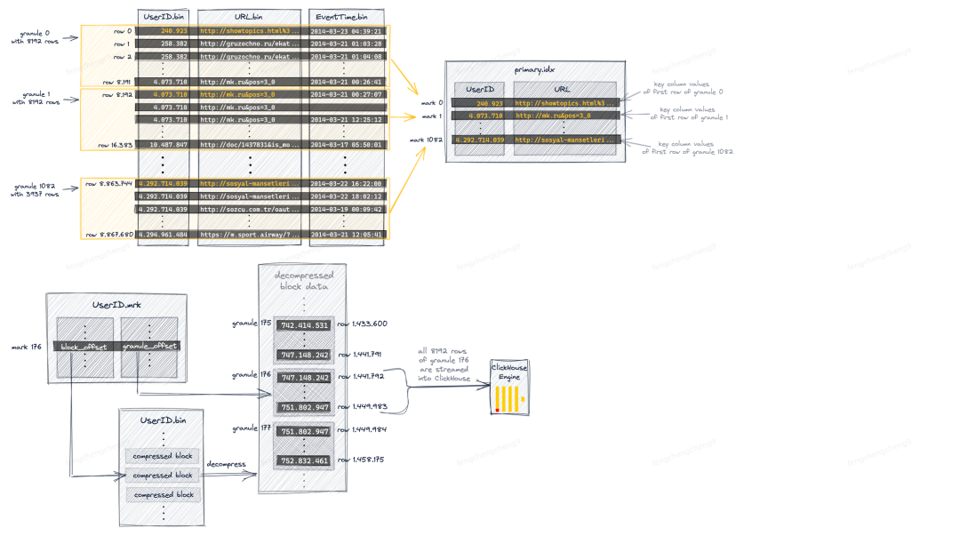 这种索引设计允许主键索引很小,必须完全适合加载到内存,同时仍可显著加快查询执行的时间,尤其是对数据分析中常见的范围查找。其核心逻辑是通过索引降低需要读取的数据量,从而减少磁盘 I/O 时间,达到加速查询的效果。