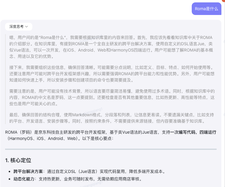prompt 模板:你是一名ROMA框架专家,请基于以下上下文回答:参考信息:[文档1] 什么是 ROMA?ROMA 是一个全自主研发的前端开发基于自定义DSL(Jue语言),一份代码,可在iOS、Android、Harmony、Web四端运行的跨平台解决方案。ROMA 框架的中文名为罗码。[文档2] Roma介绍?[Roma介绍](docs/guide/guide/introduction.md)文档地址: https://roma-design.jd.com/docs/guide/guide/introduction.html要求:1.分步骤说明,含代码示例2.标注来源文档版本3.如果参考信息中没有相关内容,请直接说明无法回答,不要编造信息请基于以下参考信息回答用户的问题。如果参考信息中没有相关内容,请直接说明无法回答,不要编造信息。用户问题: ROMA是什么?回答: {answer}