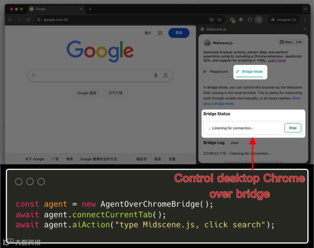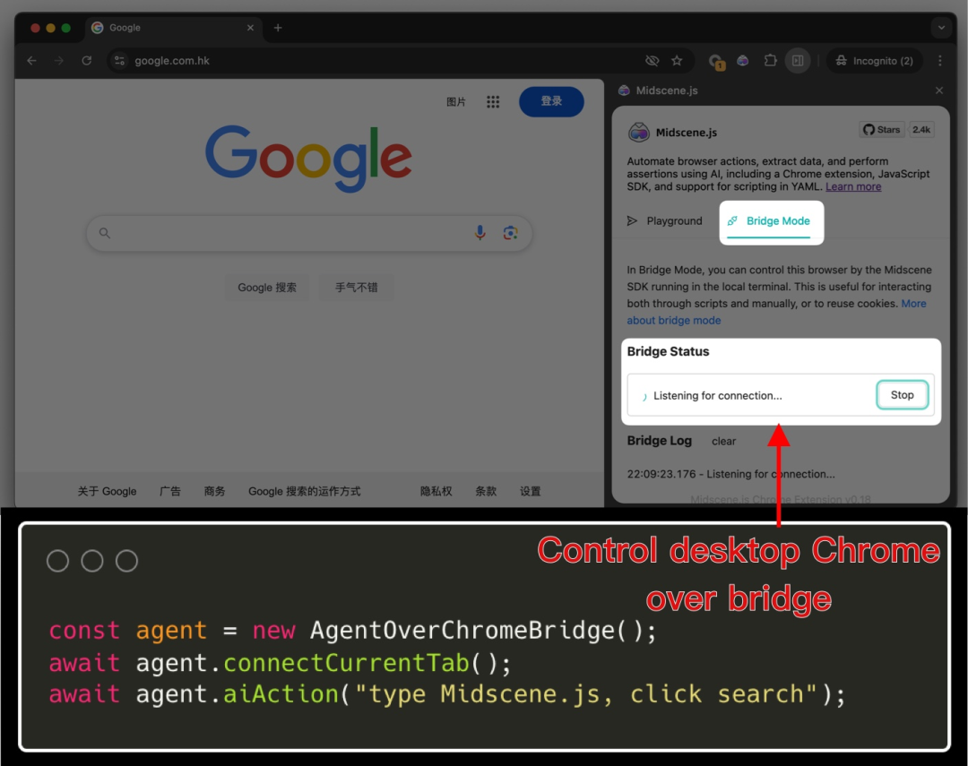 使用 Midscene 的 Chrome 插件桥接模式(Bridge Mode),你可以用本地脚本控制桌面版本的 Chrome。你的脚本可以连接到新标签页或当前已激活的标签页。