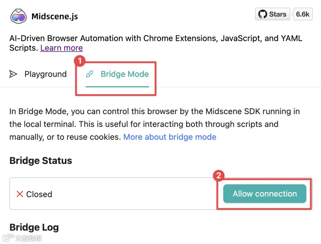 import { AgentOverChromeBridge } from "@midscene/web/bridge-mode";const sleep = (ms) => new Promise((r) => setTimeout(r, ms));Promise.resolve((async () => {const agent = new AgentOverChromeBridge();// 这个方法将连接到你的桌面 Chrome 的新标签页// 记得启动你的 Chrome 插件,并点击 'allow connection' 按钮。否则你会得到一个 timeout 错误await agent.connectNewTabWithUrl("https://www.bing.com");// 这些方法与普通 Midscene agent 相同await agent.ai('type "AI 101" and hit Enter');await sleep(3000);await agent.aiAssert("there are some search results");await agent.destroy();})());