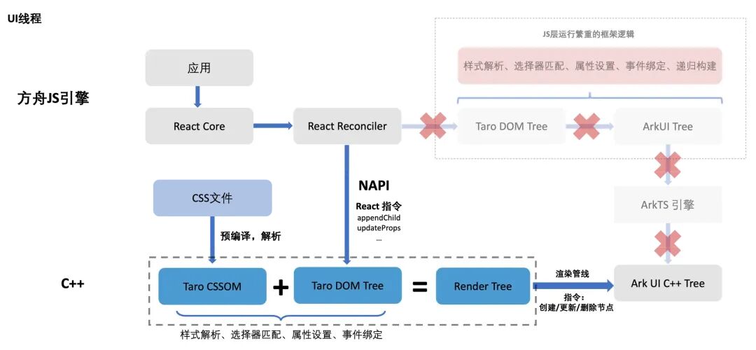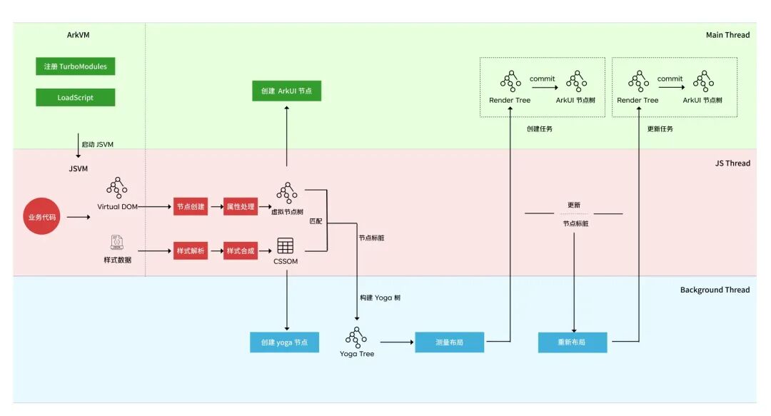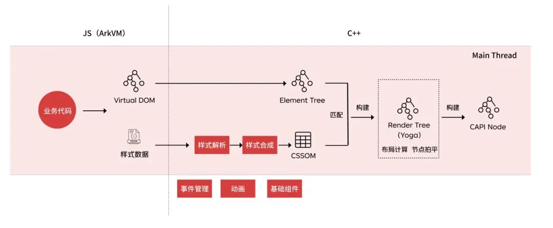 单线程架构版本的示意图如下,整个渲染过程均在主线程实现,业务代码在 ArkVM 中执行获得虚拟 DOM 树,同时读取样式数据,通过 React Reconciler ,在构建虚拟树时会调用 NAPI 在 C++ 侧构建出对应的 Element Tree,同时也会进行样式数据的解析处理,从而构建出 CSSOM 对象,Element Tree 和 CSSOM 对象会进行匹配从而构建出带有样式的 Render Tree,在这一步也会同时创建 yoga 节点,进行布局计算,最后会再基于布局计算的结果生成 C API 的 ArkNode Tree,从而实现上屏渲染。