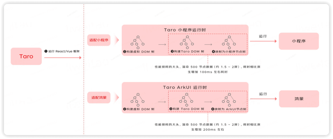 Taro 适配鸿蒙方案经过了多个版本的演进迭代,最初版本我们采用的是对接到鸿蒙原生 ArkTS 语言的方式来实现,这和 Taro 适配微信小程序的方案类似,都是通过模拟浏览器 DOM/BOM 环境,然后运行 React 代码构建出虚拟 DOM 树,再将虚拟 DOM 树以递归遍历的方式构建出宿主环境(小程序/鸿蒙)的渲染节点树,从而实现页面渲染