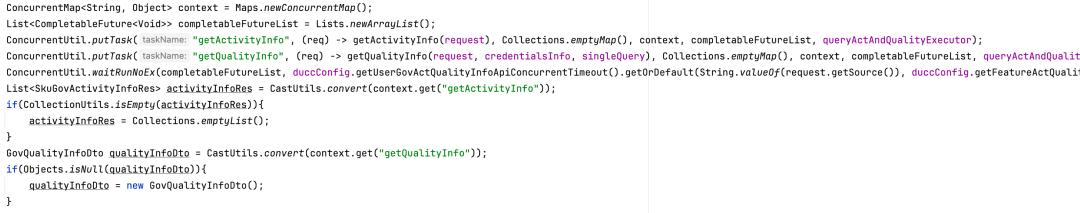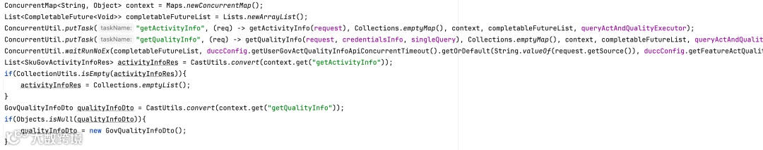 上文中 queryActTp 为 getActivityInfo 执行并发任务,其中包含两个子任务、 queryQualityTp 为 getQualityInfo 执行并发任务,其中五个子任务。同时将这俩任务放到queryActAndQualityTp中并行。