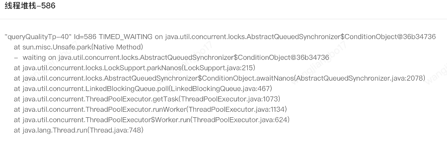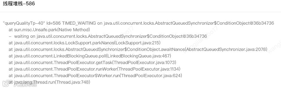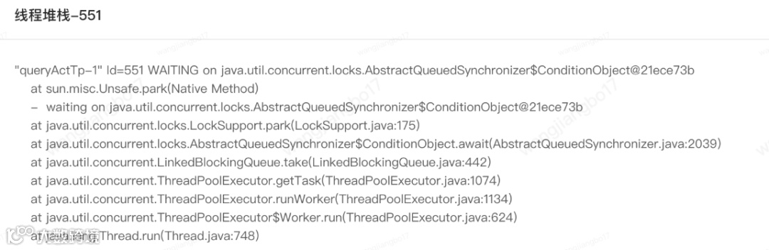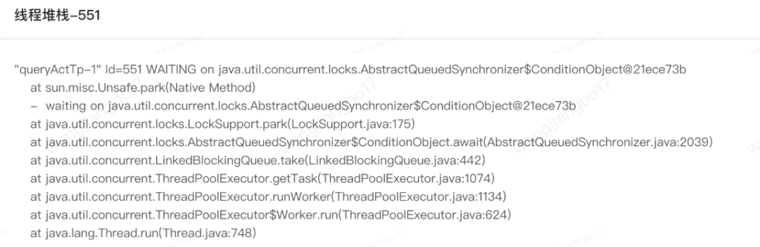 上文中同样的调用方式,但是出现了两种线程状态,理论上应该都是TIMED_WAITING。针对queryActTp我们可以发现堆栈信息中也是LockSupport.park而不是LockSupport.parkNanos。具体原因有待进一步分析。