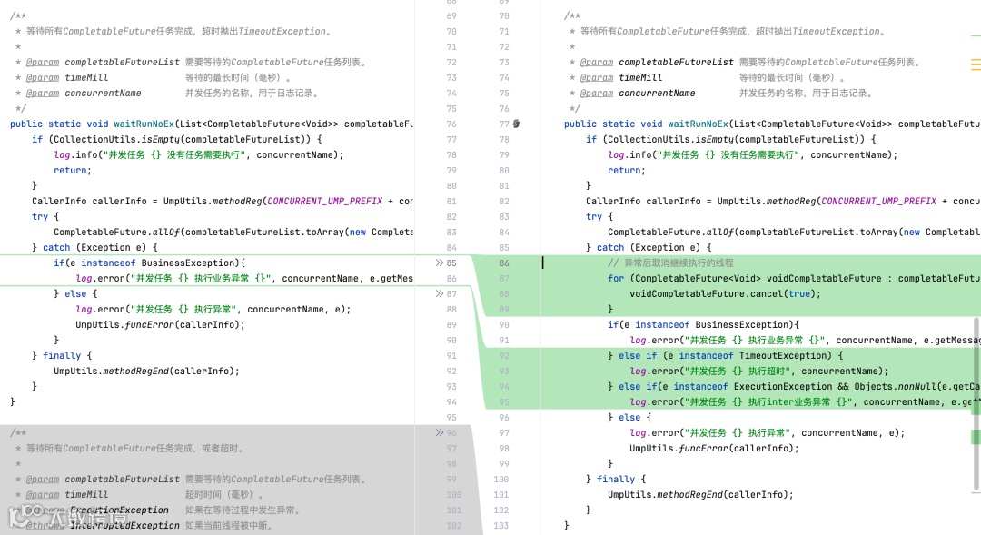 1、 allOf异常后,取消所有线程的继续执行。这么做为了防止有些线程超时后仍在执行,浪费部分CPU资源,线上发现确实存在较多的超时情况。2、 这里的异常日志较多,根据异常类型进行区分,去掉没用的堆栈日志。
