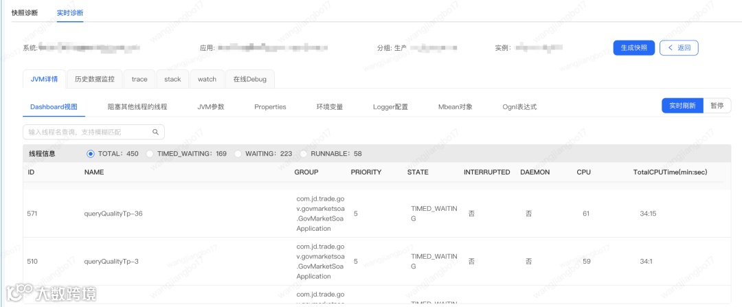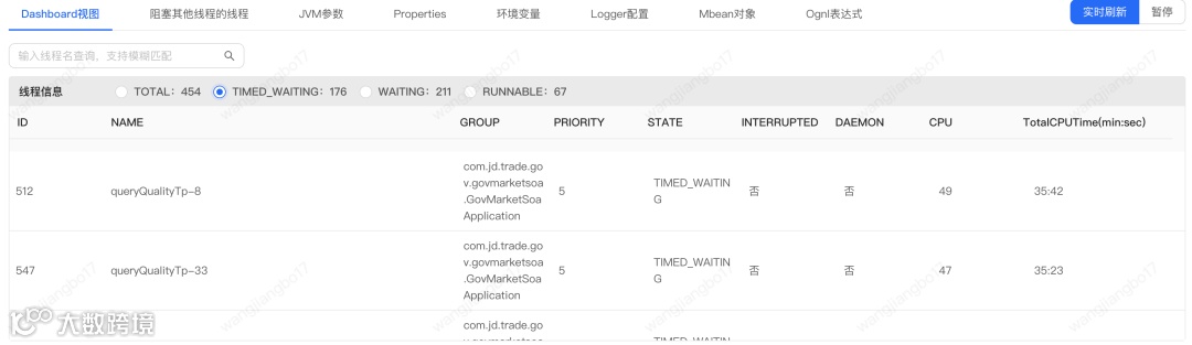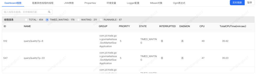 通过上图我们可以发现timed_waiting的topN线程都是查询国补资质的。