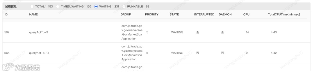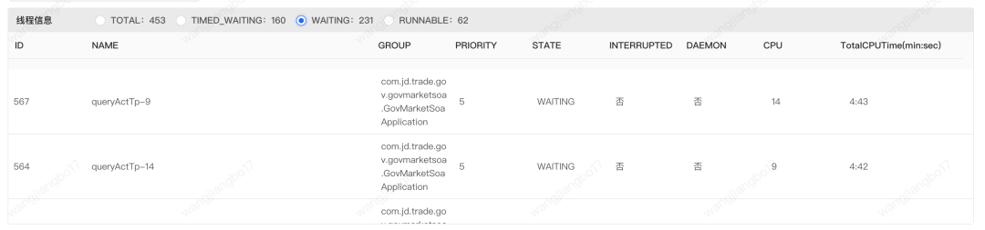 通过上图我们可以发现waiting的topN线程都是查询国补活动的。