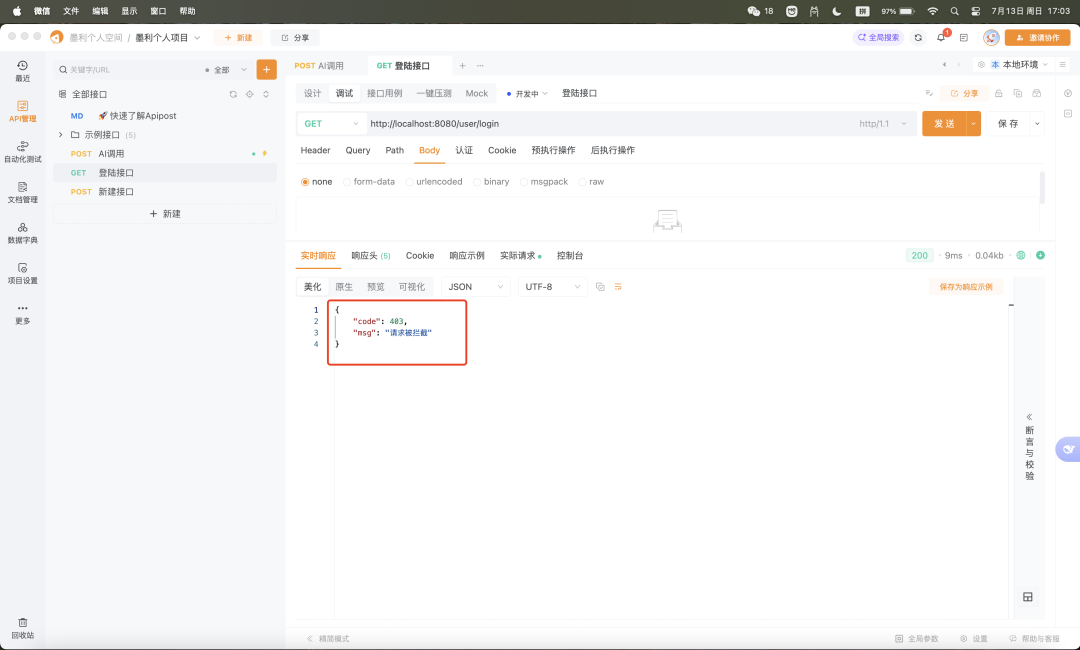 public class AuthInterceptor implements HandlerInterceptor {public boolean preHandle(HttpServletRequest request,HttpServletResponse response,Object handler) throws Exception {HttpSession session = request.getSession();if (session.getAttribute("user") == null) {response.sendRedirect("/login");return false;}return true;}}