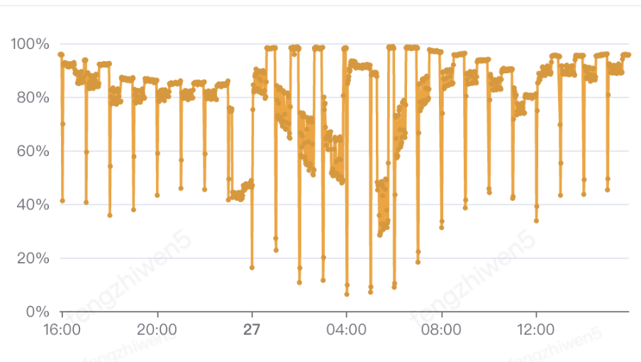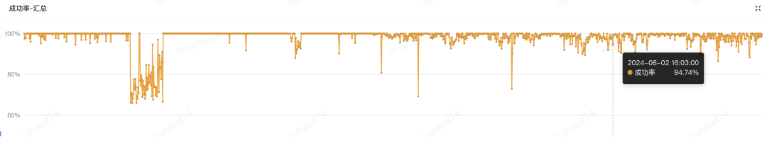构建一个有效的业务指标是一个循序渐进的过程。下图是一个监控数据同步成功率的业务指标,由于存在入参异常等噪音数据,导致成功率波动较大,起初并不具备监控意义。
