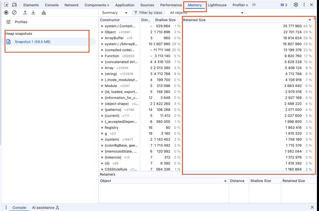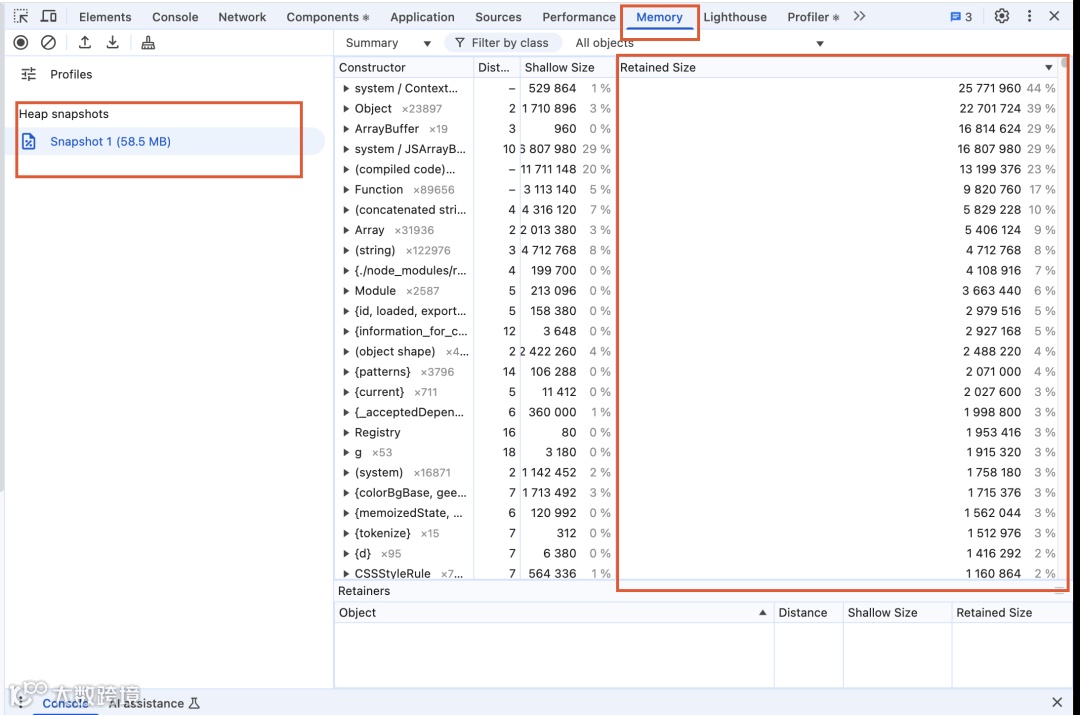 检查 Retainers(持有者),找到导致内存泄漏的代码。
